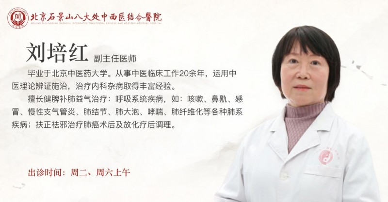 刘培红,副主任医师,北京石景山八大处中西医结合医院特聘专家,出诊时间周二、周六上午。毕业于北京中医药大学。从事中医临床工作20余年,运用中医理论辨证施治,治疗内科杂病取得丰富经验。擅长健脾补肺益气治疗:呼吸系统疾病,如:咳嗽、鼻鼽、感冒、慢性支气管炎、肺结节、肺大泡、哮喘、肺纤维化等各种肺系疾病;扶正祛邪治疗肺癌术后及放化疗后调理。