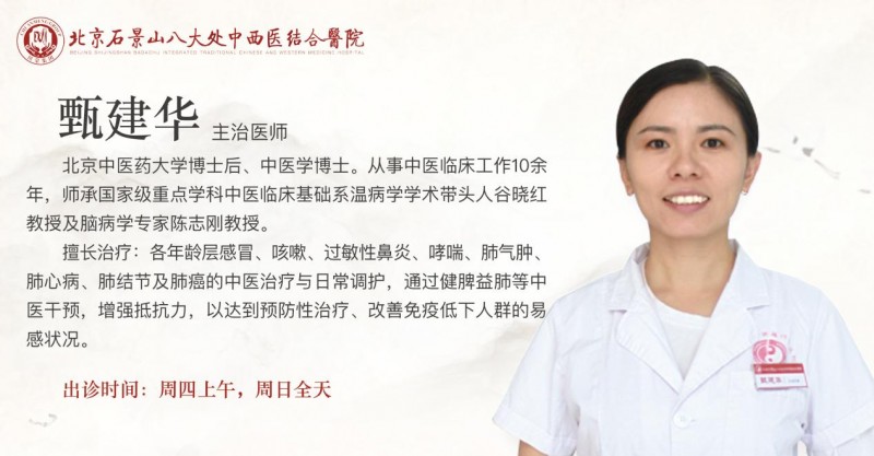 甄建华,北京石景山八大处中西医结合医院肺病科主治医师,出诊时间周四上午,周日全天。北京中医药大学博士后、中医学博士。从事中医临床工作10余年,师承国家级重点学科中医临床基础系温病学学术带头人谷晓红教授及脑病学专家陈志刚教授。擅长治疗:各年龄层感冒、咳嗽、过敏性鼻炎、哮喘、肺气肿、肺心病、肺结节及肺癌的中医治疗与日常调护,通过健脾益肺等中医干预,增强抵抗力,以达到预防性治疗、改善免疫低下人群的易感状况。